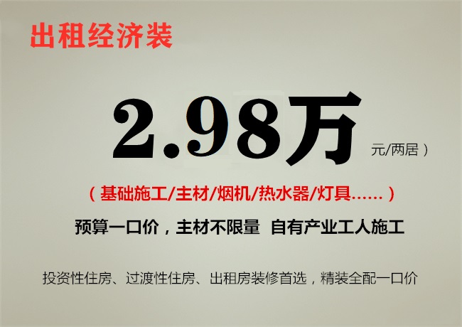 特点: 1、出租房装修大包首选方案,经济、实惠、性价比高。 2、包括项目全,包括主材范围大,装修完即可用过渡自住或出租,包括基础装修、瓷砖、 卫浴、门、橱柜、灯具、烟机灶、热水器等; 3、主材、基础装修、只要是符合要求,需要多少配多少,不限数量。