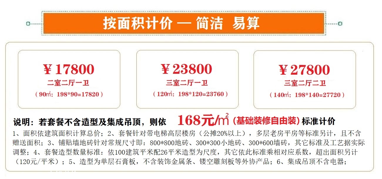 专为基础装修定制,含设计、人工、辅料及造型,性价比高;基础装修首选。