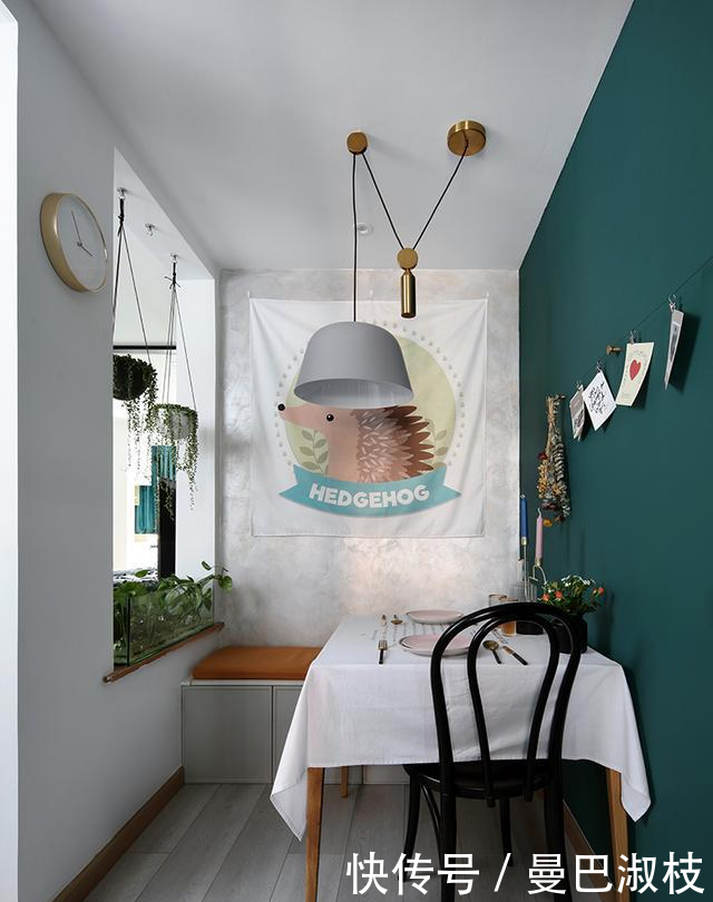 电视墙后面和餐厅相连,旁边的门洞上放置一个玻璃盆用来养绿植,天花上也安装了悬挂养绿植的花盆,简单的小角落,让家里增添了不少特色。