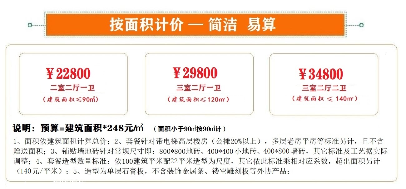 专为基础装修定制,含设计、人工、辅料及造型,性价比高;基础装修首选。
